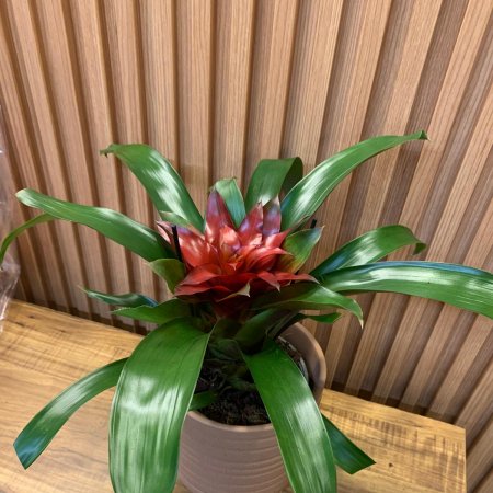 עציץ גוזמניה בעל פרח אדום מהממם ומיוחד מגיע בכלי חרס עגול תואם בהתאם למלאי בחנות